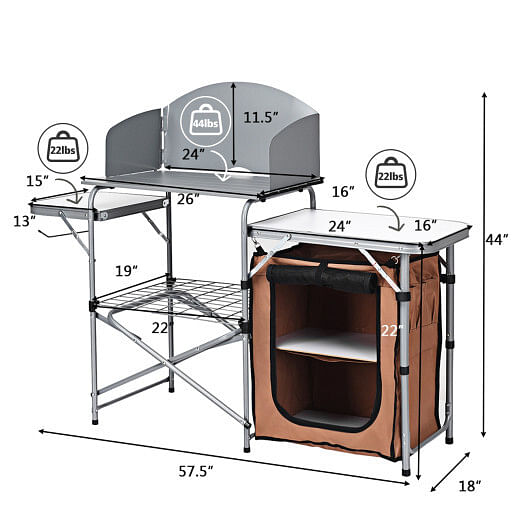 Equipped with sturdy aluminium tubes heat-resistant aluminium and moisture-resistant MDF it features heavy-duty durability stability so that can service you for long time. This outdoor kitchen stand also features a large top surface area two side tables a lower shelf and zippered bag which are ideal for storing supplies condiments and food. It also includes a steel windscreen that can block the wind for heat retention and faster cooking. The lightweight and one-piece design make you hold easily and provide you a lot storage room. Easy set-up and folding down less than a minute allow you enjoy the camping trip as soon as possible.