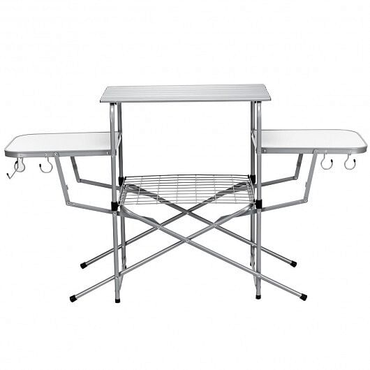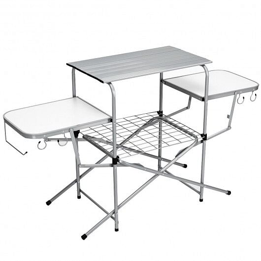 ● Large tabletop 2 side shelves and lower shelf offer enough space for all of your cooking gear
