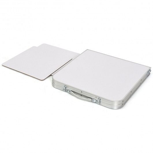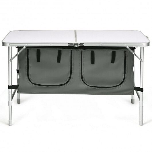 Detachable table legs give you two different heights. In addition you can easily adjust the height and balance of the table by rotating the knobs at the bottom of the table legs. The triangular structure and reinforcement measure greatly improve the stability and load-bearing capacity of the table. More importantly this outdoor folding table has a large storage area. When you have finished assembling the table you can put food drinks or utensils into the locker.